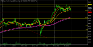 次に4時間足からみる中期視点についてですが、中期視点で考えますと前回高値(30,000円)からFibo61.8%まで下落しているところでありますので、売りも買いも手を付けれる状況ではないかなと考えております。ただ、重要なのは長期の視点と中期の視点において、目安にするラインがどのくらいかぶっているかが重要な意味をもちますので、そう考えると、今、Fibo100.0%は27,000円でありこれは長期のFibo138.2%に値し何らかの抵抗が走っていることがわかるかと思います。